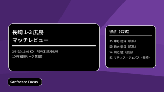 試合・レビュー 【試合レビュー】長崎1-3広島|勝負を決めた「後半4分間」と、支配率では測れない効率差 2/6、長崎のPEACE STADIUMで行われた「長崎vs広島」をマッチレビュー。公式記録ベースで得点の順番・試合の流れ・勝負の分岐点を、初心者にも分かる言葉で整理します。スコア:長崎 1-3 広島得点:(広島)35’中野就斗/50’鈴木... 2026.02.07 試合・レビュー